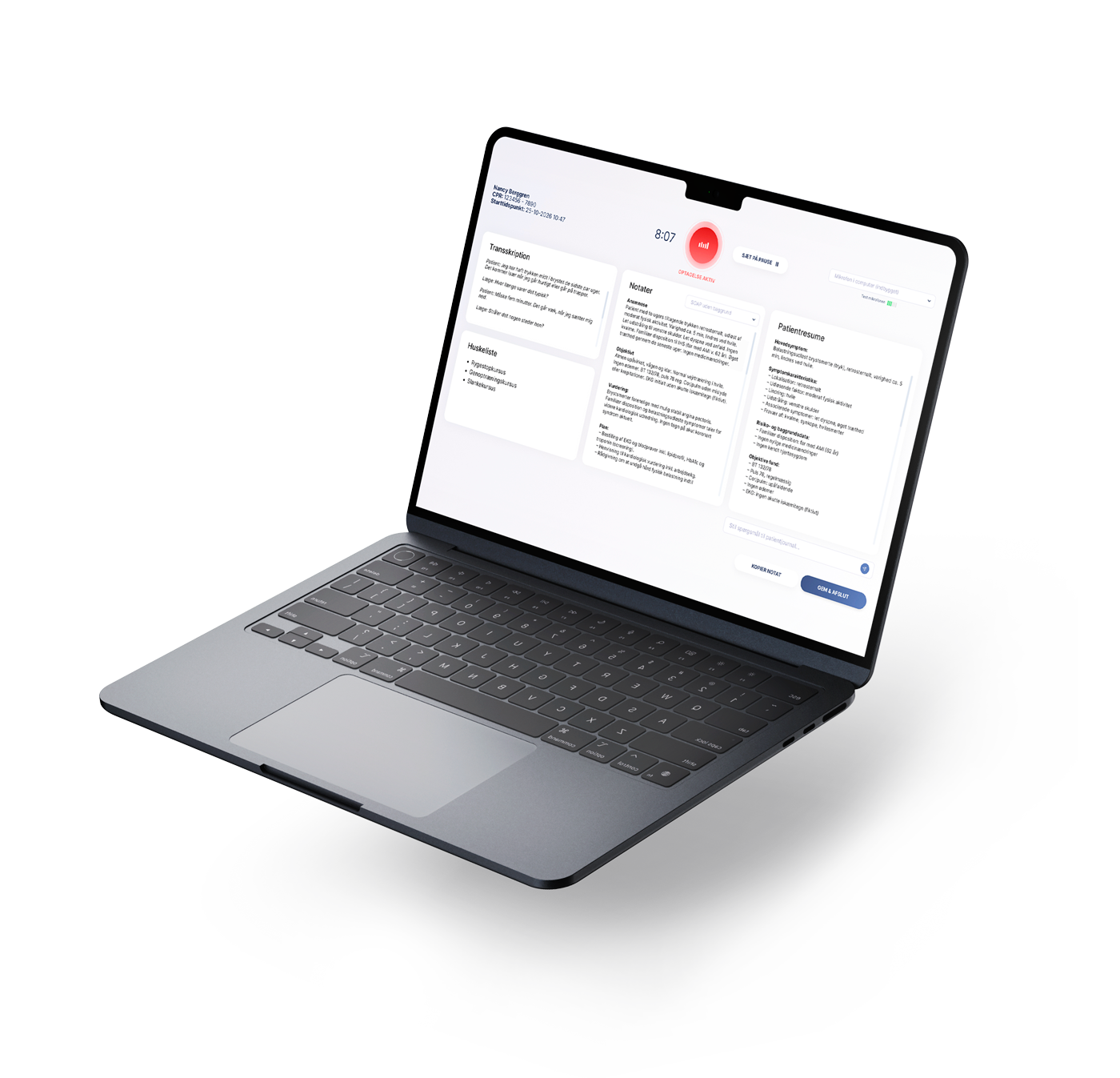 Typisk under fem minutter. Du opretter en gratis konto, starter optagelsen og får et struktureret notatudkast efter første konsultation. Online onboarding og korte introduktionsvideoer gør hele processen enkel. De fleste er fuldt trygge efter én dag og arbejder normalt efter 2–3 konsultationer.